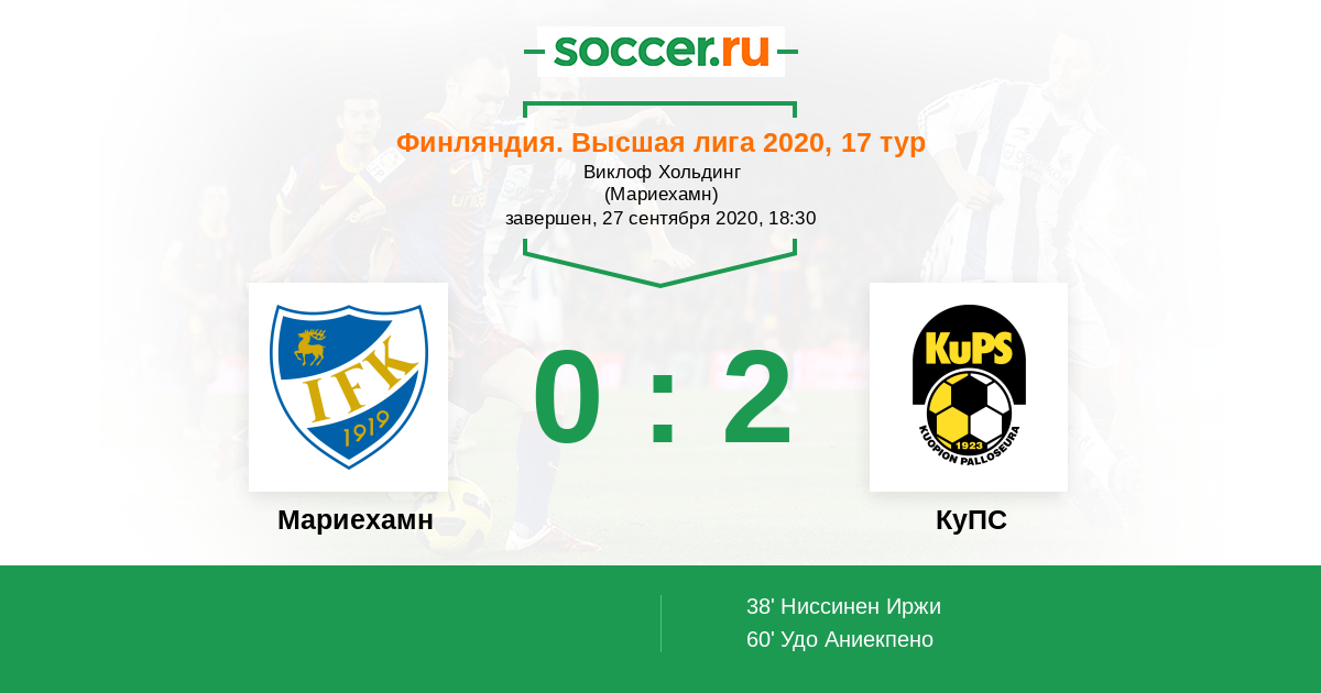 Финляндия. Высшая лига 02.09.2012 Мариехамн Логотип футбольный клуб Мариехамн 2:0 Логотип футбольный клуб КуПС (Купио) КуПС