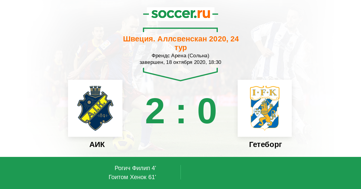 Швеция. Аллсвенскан 02.07.2020 Гетеборг Логотип футбольный клуб Гетеборг 1:0 Логотип футбольный клуб АИК (Стокгольм) АИК