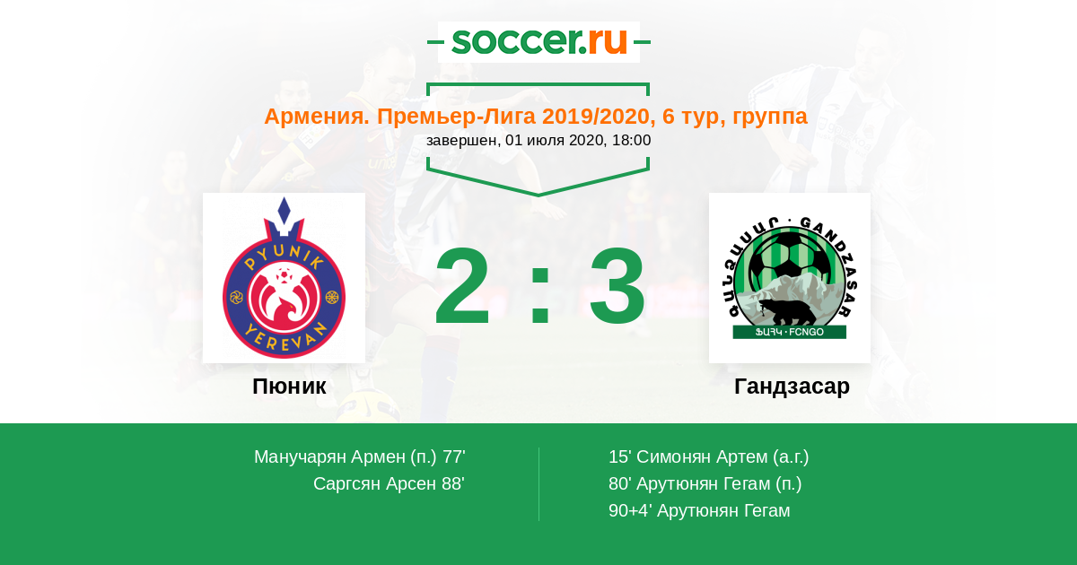 Армения. Премьер-лига 26.06.2010 Пюник Логотип футбольный клуб Пюник (Ереван) 0:1 Логотип футбольный клуб Гандзасар (Капан) Гандзасар