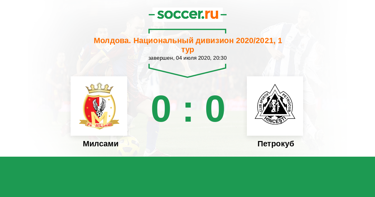 Молдова. Национальный дивизион 19.09.2020 Петрокуб Логотип футбольный клуб Петрокуб (Хынчешты) 1:2 Логотип футбольный клуб Милсами (Оргеев) Милсами