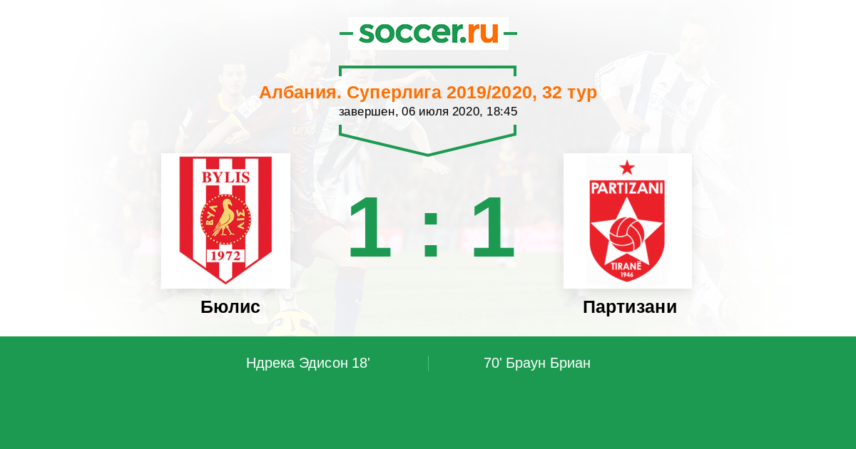 Албания. Суперлига 26.05.2021 Бюлис Логотип футбольный клуб Бюлис (Баллш) 2:4 Логотип футбольный клуб Партизани (Тирана) Партизани