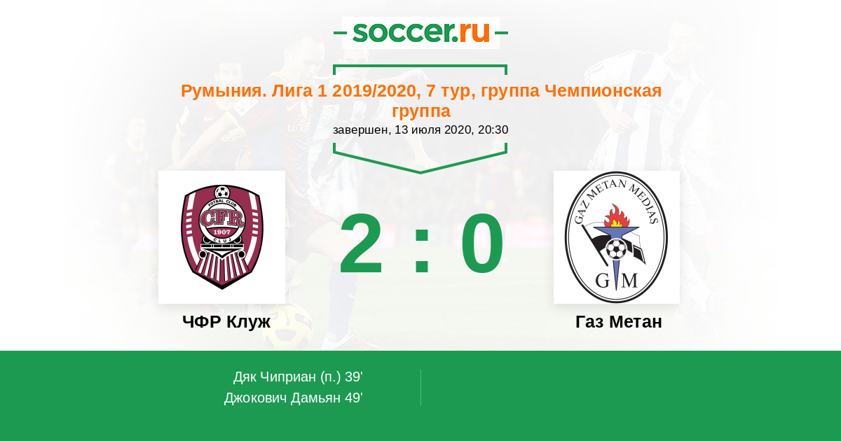 Румыния. Лига 1 01.11.2020 ЧФР Клуж Логотип футбольный клуб ЧФР Клуж (Бухарест) 1:2 Логотип футбольный клуб Газ Метан (Медиаш) Газ Метан