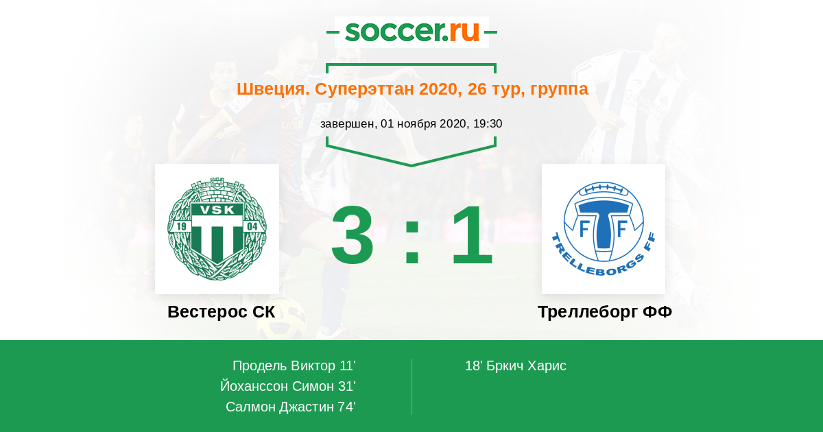 Швеция. Суперэттан 01.09.2019 Треллеборг ФФ Логотип футбольный клуб Треллеборг ФФ 2:1 Логотип футбольный клуб Вестерос СК Вестерос СК