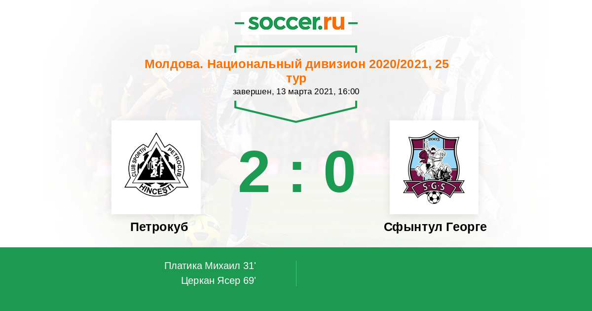 Молдова. Национальный дивизион 14.04.2018 Сфынтул Георге Логотип футбольный клуб Сфынтул Георге (Суручены) 3:6 Логотип футбольный клуб Петрокуб (Хынчешты) Петрокуб