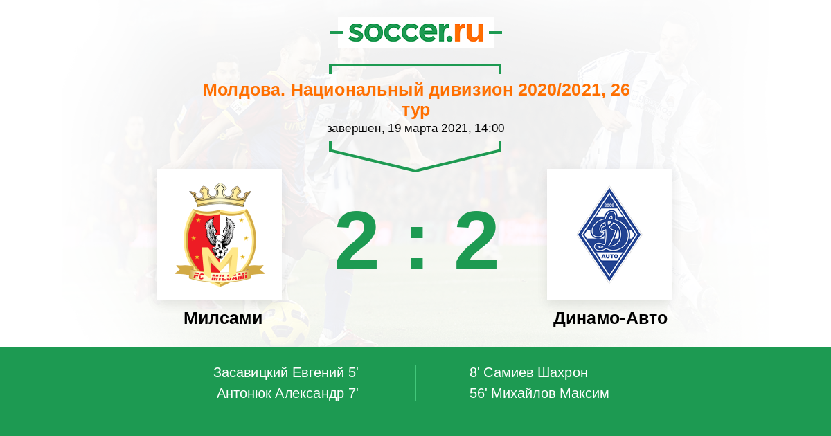 Молдова. Национальный дивизион 21.08.2021 Милсами Логотип футбольный клуб Милсами (Оргеев) 4:1 Логотип футбольный клуб Динамо-Авто (Тирасполь) Динамо-Авто