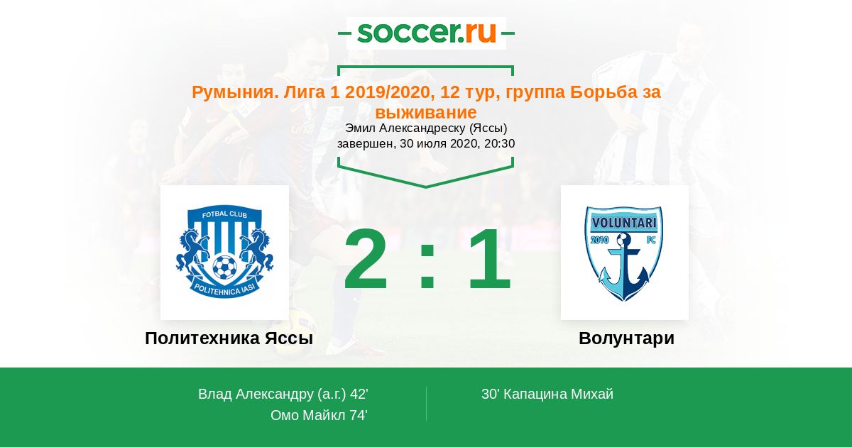 Румыния. Лига 1 21.06.2020 Волунтари Логотип футбольный клуб Волунтари (Илфов) 1:0 Логотип футбольный клуб Политехника Яссы Политехника Яссы