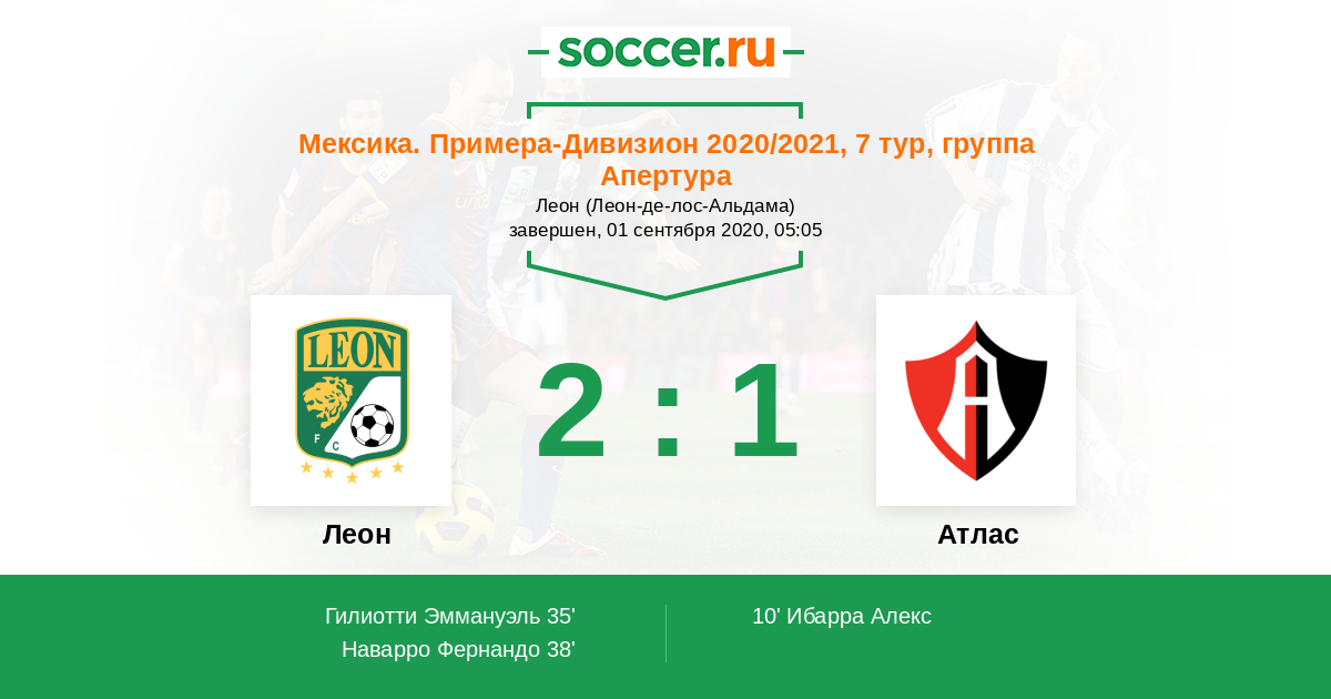Мексика. Примера-Дивизион 26.09.2021 Атлас Логотип футбольный клуб Атлас (Гвадалахара) 2:0 Логотип футбольный клуб Леон Леон