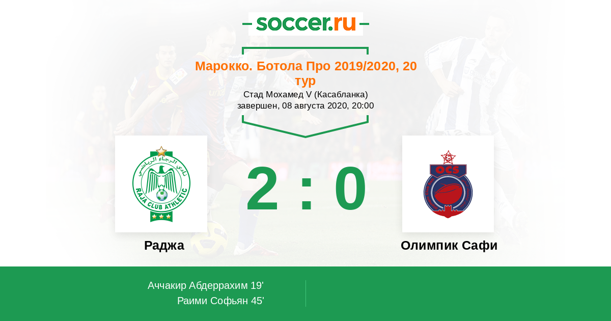 Марокко. Ботола Про 27.04.2021 Раджа Логотип футбольный клуб Раджа (Касабланка) 2:0 Логотип футбольный клуб Олимпик Сафи Олимпик Сафи