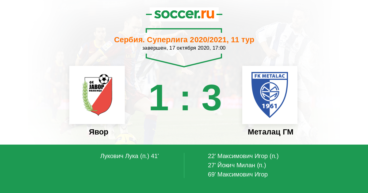 Сербия. Суперлига 30.10.2010 Металац ГМ Логотип футбольный клуб Металац ГМ (Горни-Милановац) 1:3 Логотип футбольный клуб Явор (Иваньица) Явор