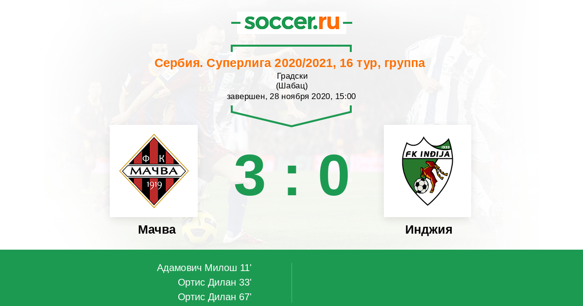 Сербия. Первая лига 19.11.2016 Мачва Логотип футбольный клуб Мачва (Шабац) 1:2 Логотип футбольный клуб Инджия Инджия