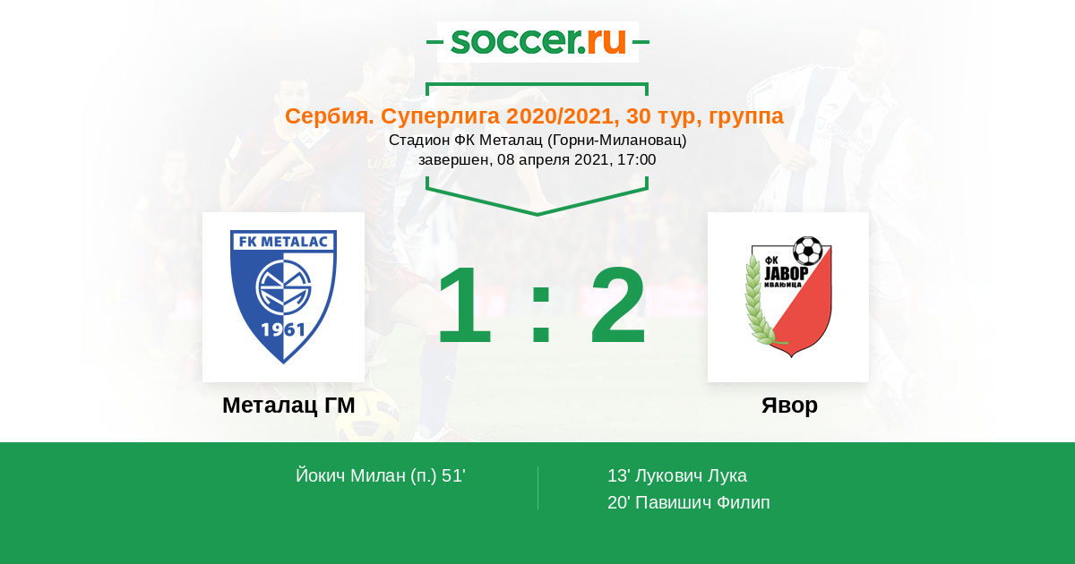 Сербия. Суперлига 17.10.2020 Явор Логотип футбольный клуб Явор (Иваньица) 1:3 Логотип футбольный клуб Металац ГМ (Горни-Милановац) Металац ГМ