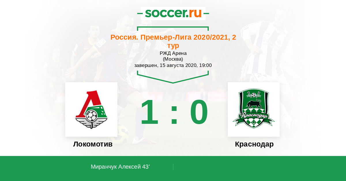 Россия. Премьер-Лига 22.08.2021 Локомотив Логотип футбольный клуб Локомотив (Москва) 2:1 Логотип футбольный клуб Краснодар Краснодар