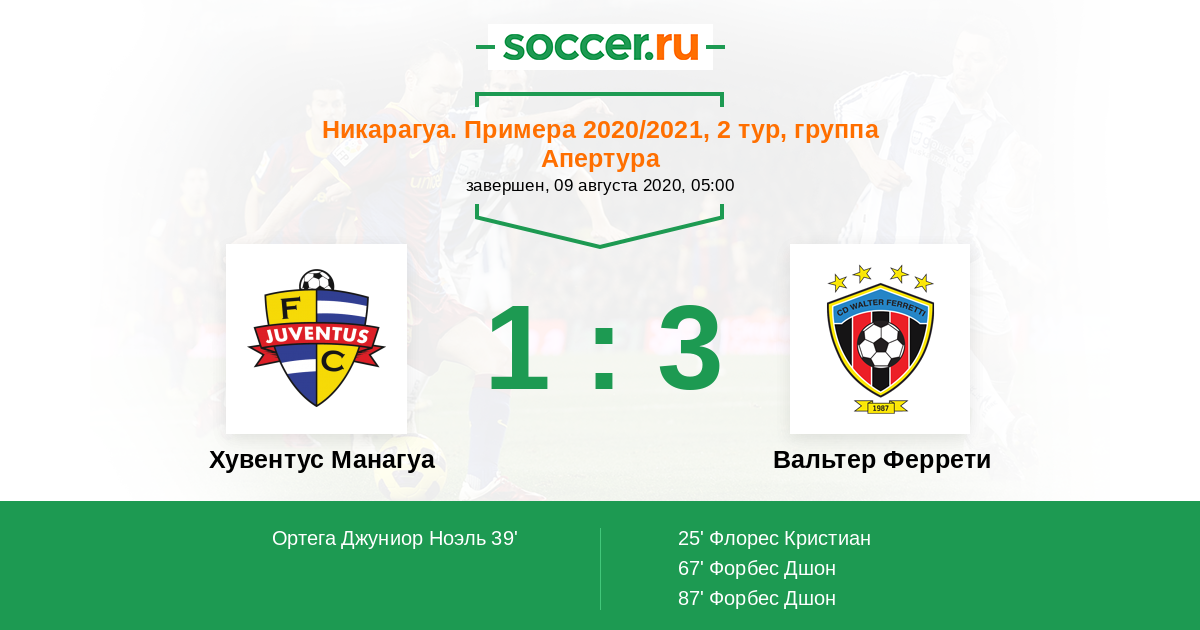 Никарагуа. Примера 26.03.2020 Хувентус Манагуа Логотип футбольный клуб Хувентус Манагуа 4:1 Логотип футбольный клуб Вальтер Феррети (Манагуа) Вальтер Феррети