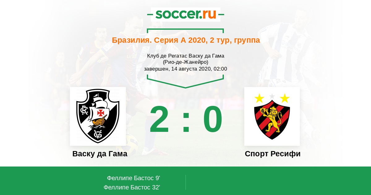 Бразилия. Серия А 14.11.2020 Спорт Ресифи Логотип футбольный клуб Спорт Ресифи 0:2 Логотип футбольный клуб Васку да Гама (Рио-де-Жанейро) Васку да Гама