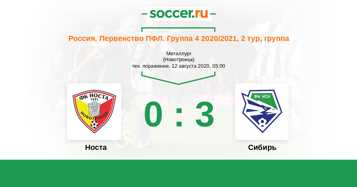 Россия. Вторая лига. Группа 4 12.06.2021 Сибирь Логотип футбольный клуб Сибирь (Новосибирск) 1:0 Логотип футбольный клуб Носта (Новотроицк) Носта