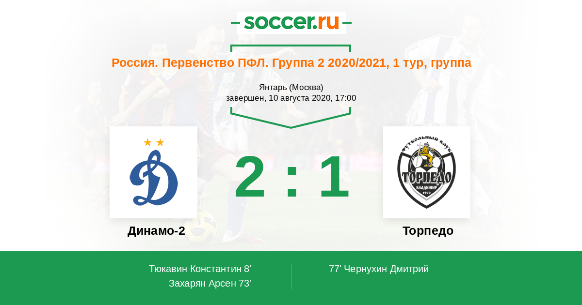 Россия. Вторая лига. Группа 2 10.09.2021 Динамо-2 Логотип футбольный клуб Динамо-2 (Москва) 2:0 Логотип футбольный клуб Торпедо (Владимир) Торпедо