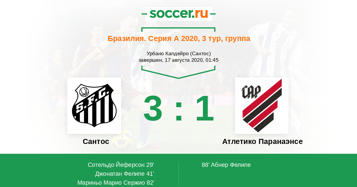 Бразилия. Серия А 01.10.2016 Сантос Логотип футбольный клуб Сантос (Сан-Паулу) 2:0 Логотип футбольный клуб Атлетико Паранаэнсе (Куритиба) Атлетико Паранаэнсе