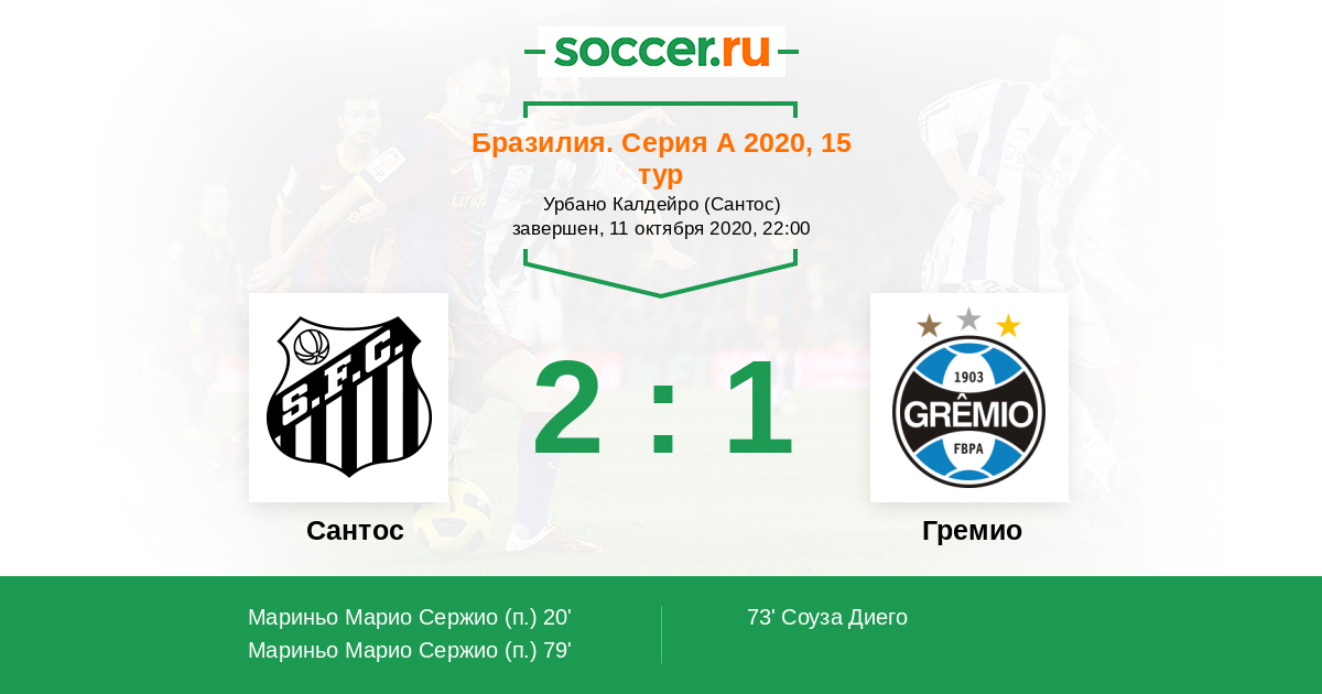 Бразилия. Серия А 16.10.2015 Гремио Логотип футбольный клуб Гремио (Порту-Алегри) 1:0 Логотип футбольный клуб Сантос (Сан-Паулу) Сантос