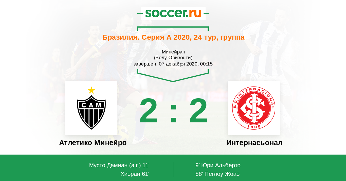 Бразилия. Серия А 23.08.2020 Интернасьонал Логотип футбольный клуб Интернасьонал (Порту-Алегри) 1:0 Логотип футбольный клуб Атлетико Минейро (Белу-Оризонти) Атлетико Минейро