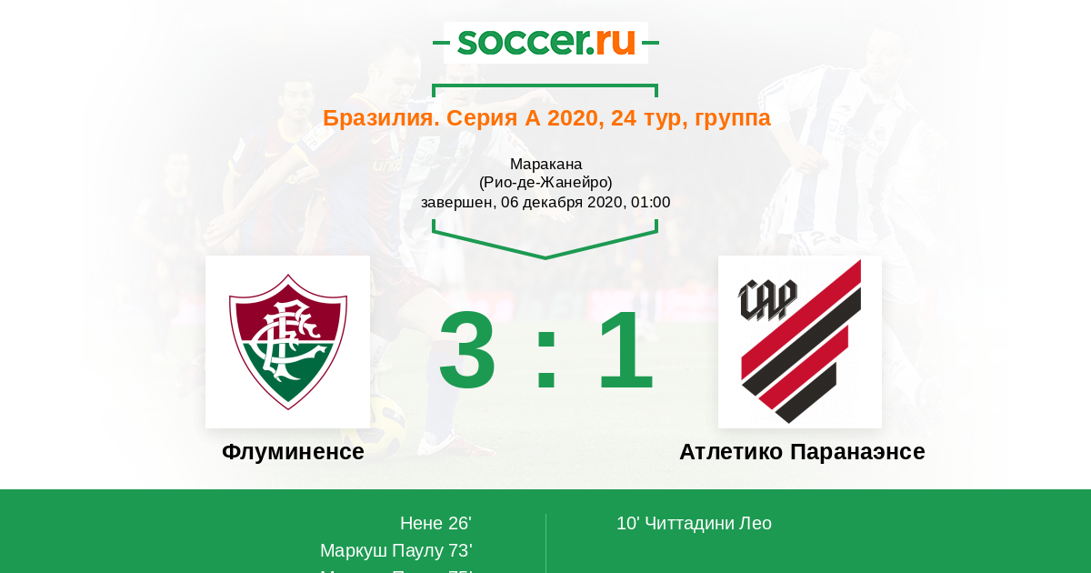 Бразилия. Серия А 30.06.2021 Флуминенсе Логотип футбольный клуб Флуминенсе (Рио-де-Жанейро) 1:4 Логотип футбольный клуб Атлетико Паранаэнсе (Куритиба) Атлетико Паранаэнсе