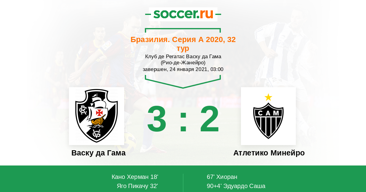 Бразилия. Серия А 02.05.2019 Васку да Гама Логотип футбольный клуб Васку да Гама (Рио-де-Жанейро) 1:2 Логотип футбольный клуб Атлетико Минейро (Белу-Оризонти) Атлетико Минейро