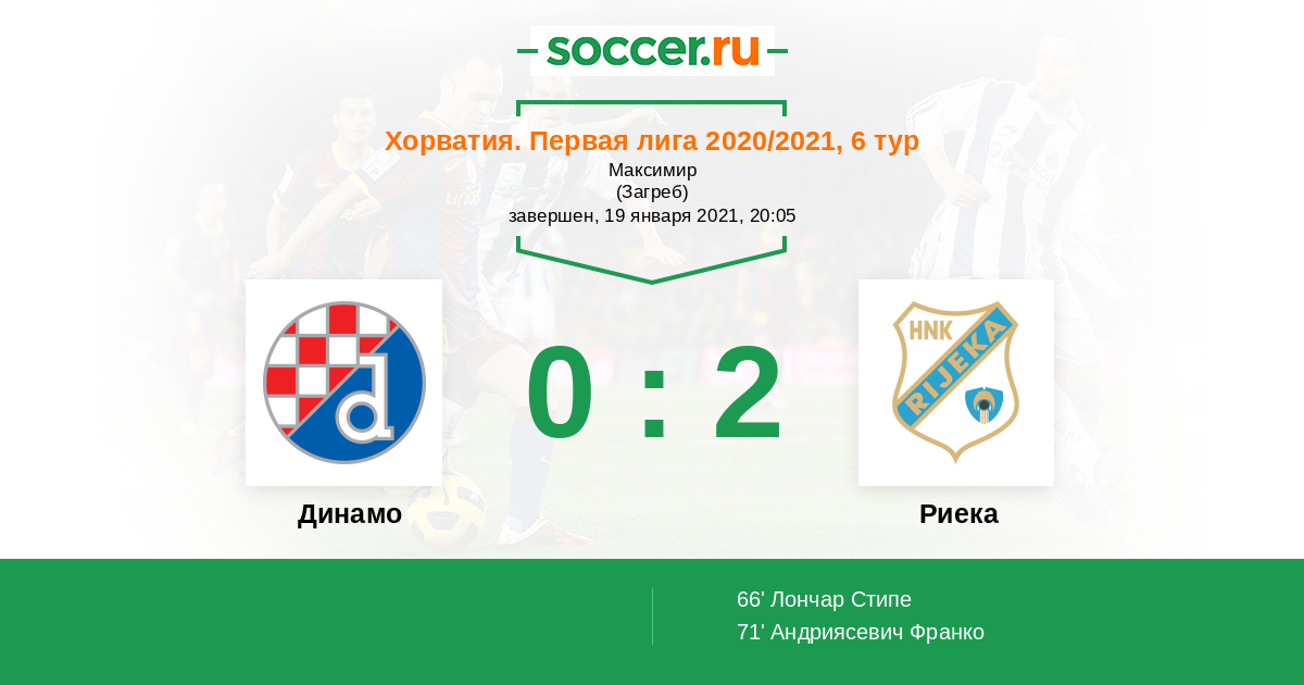 Хорватия. Первая лига 30.01.2022 Динамо Логотип футбольный клуб Динамо (Загреб) 2:0 Логотип футбольный клуб Риека Риека