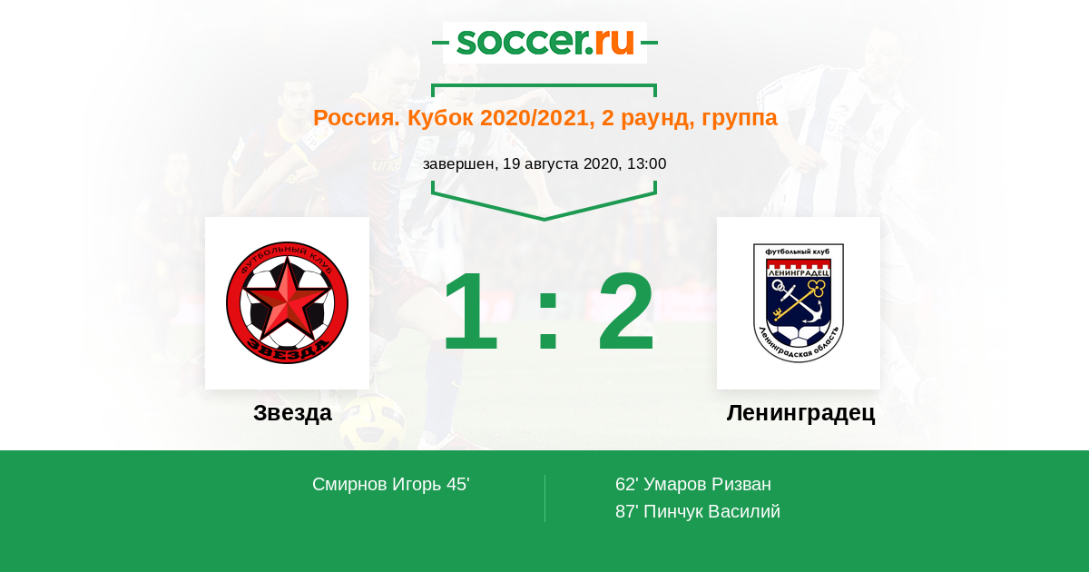Россия. Вторая лига. Группа 2 14.09.2021 Ленинградец Логотип футбольный клуб Ленинградец (Ленинградская обл.) 2:0 Логотип футбольный клуб Звезда (Санкт-Петербург) Звезда