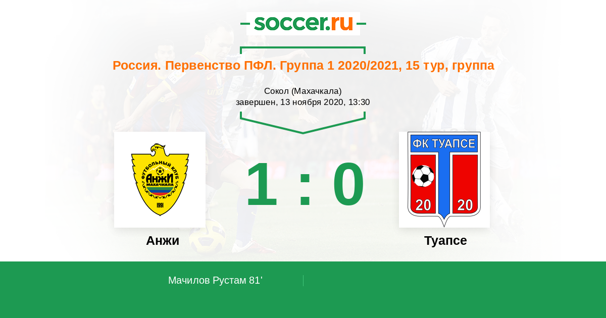 Россия. Вторая лига. Группа 1 12.11.2021 Туапсе Логотип футбольный клуб Туапсе 1:1 Логотип футбольный клуб Анжи (Махачкала) Анжи