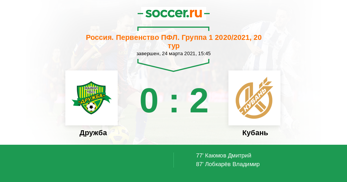 Россия. Вторая лига. Группа 1 29.08.2020 Кубань Логотип футбольный клуб Кубань (Краснодар) 2:0 Логотип футбольный клуб Дружба (Майкоп) Дружба