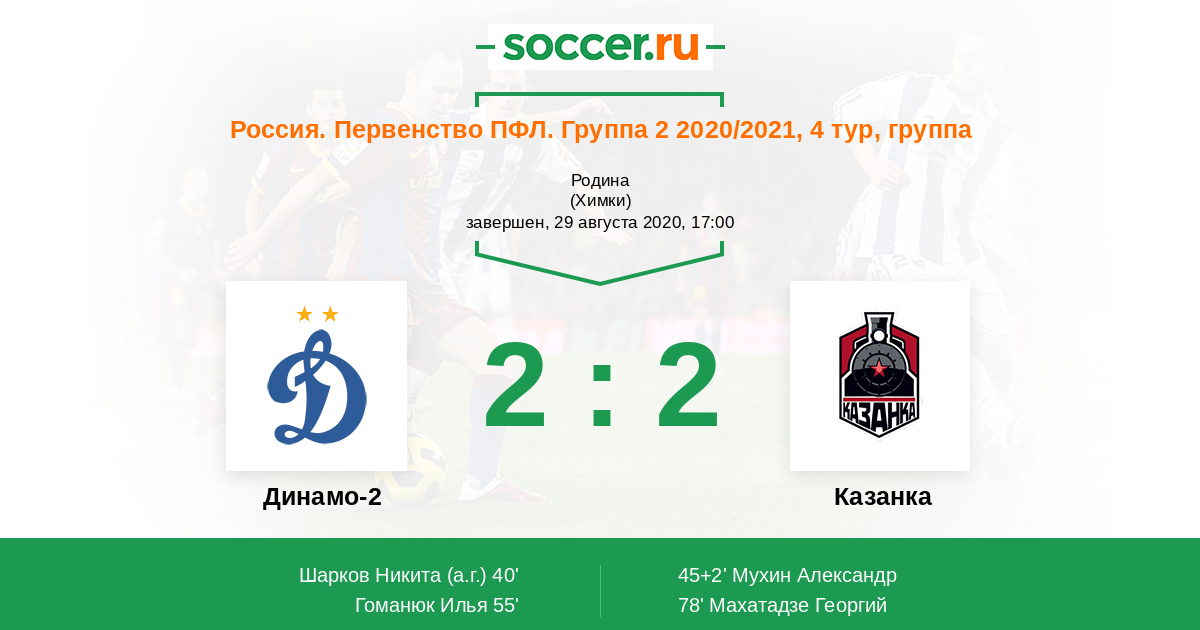 Россия. Вторая лига. Группа 2 14.09.2021 Казанка Логотип футбольный клуб Казанка (Москва) 1:1 Логотип футбольный клуб Динамо-2 (Москва) Динамо-2