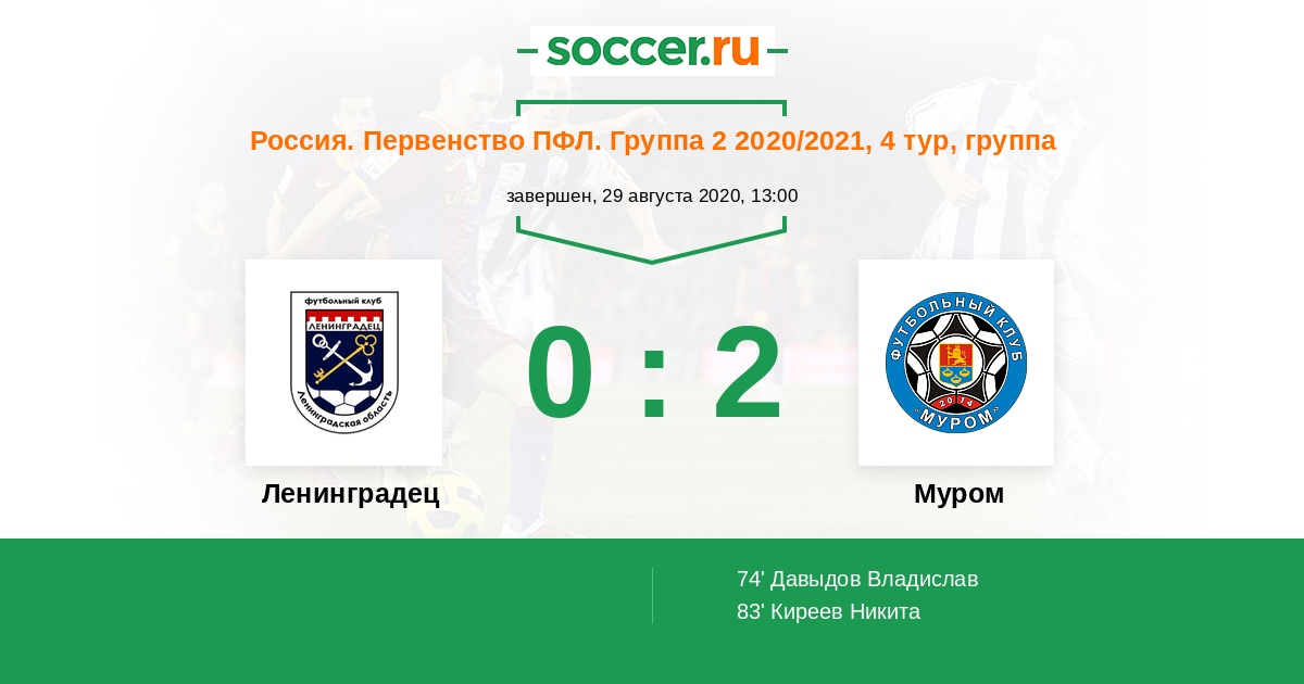 Россия. Вторая лига. Группа 2 14.09.2018 Муром Логотип футбольный клуб Муром 0:0 Логотип футбольный клуб Ленинградец (Ленинградская обл.) Ленинградец