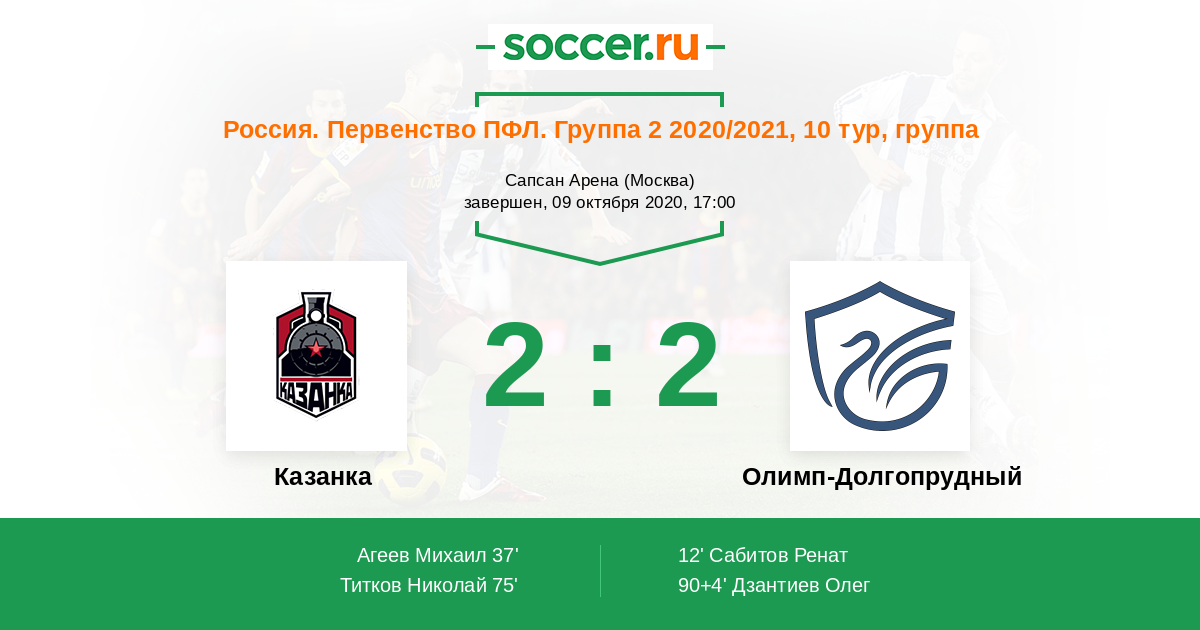 Россия. Вторая лига. Группа 2 12.04.2021 Олимп-Долгопрудный Логотип футбольный клуб Олимп-Долгопрудный 2:0 Логотип футбольный клуб Казанка (Москва) Казанка