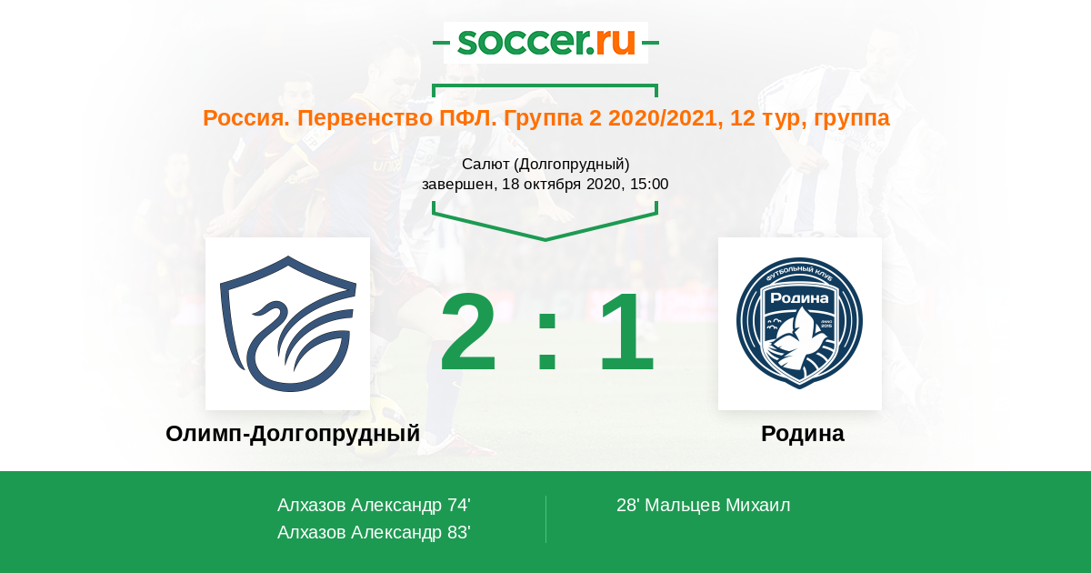 Россия. Вторая лига. Группа 2 02.04.2021 Родина Логотип футбольный клуб Родина (Москва) 1:2 Логотип футбольный клуб Олимп-Долгопрудный Олимп-Долгопрудный