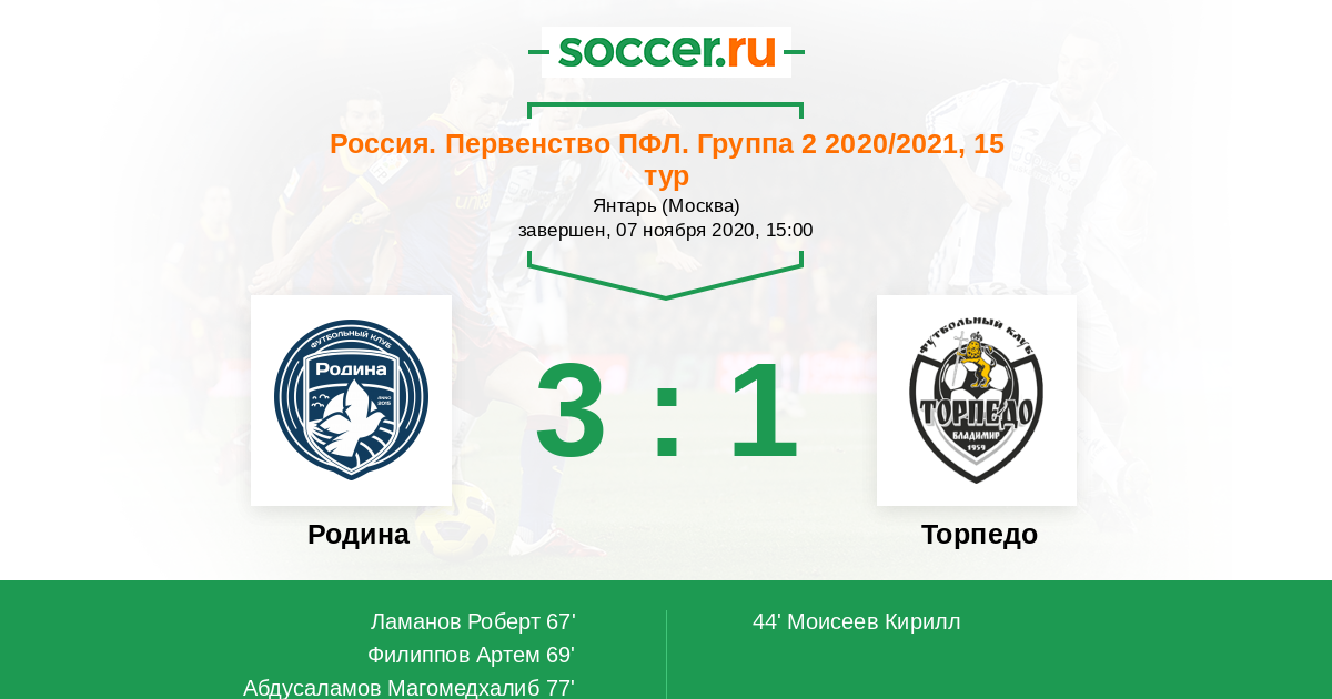 Россия. Вторая лига. Группа 2 12.11.2020 Торпедо Логотип футбольный клуб Торпедо (Владимир) 2:2 Логотип футбольный клуб Родина (Москва) Родина