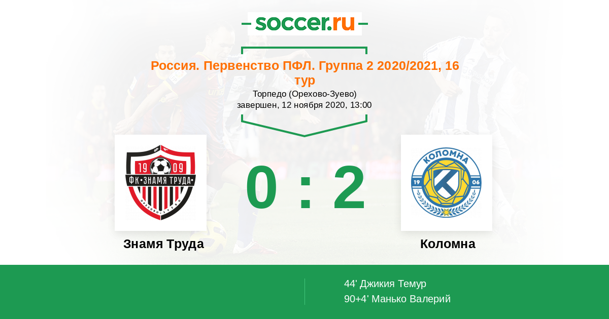 Россия. Вторая лига. Группа 2 07.11.2020 Коломна Логотип футбольный клуб Коломна 3:1 Логотип футбольный клуб Знамя Труда (Орехово-Зуево) Знамя Труда