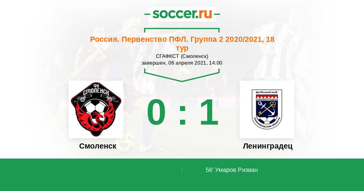 Россия. Вторая лига. Группа 2 13.10.2020 Ленинградец Логотип футбольный клуб Ленинградец (Ленинградская обл.) 4:0 Логотип футбольный клуб Смоленск Смоленск