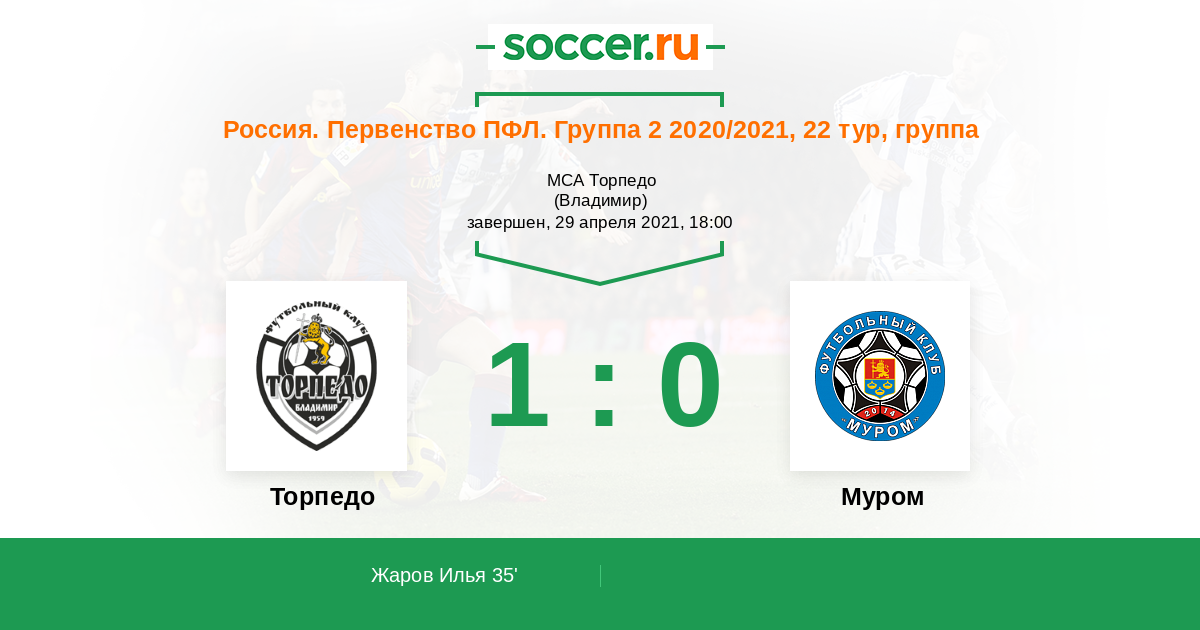 Россия. Вторая лига. Группа 2 14.09.2021 Торпедо Логотип футбольный клуб Торпедо (Владимир) 2:1 Логотип футбольный клуб Муром Муром