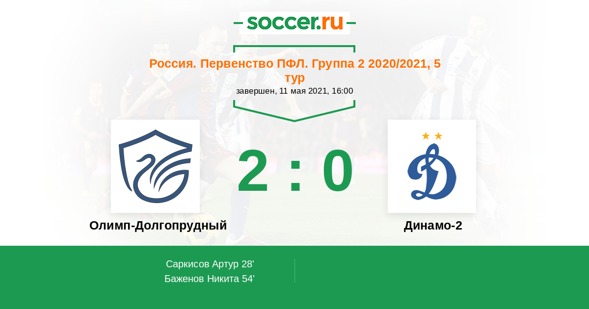 Россия. Вторая лига. Группа 2 06.09.2020 Динамо-2 Логотип футбольный клуб Динамо-2 (Москва) 3:0 Логотип футбольный клуб Олимп-Долгопрудный Олимп-Долгопрудный