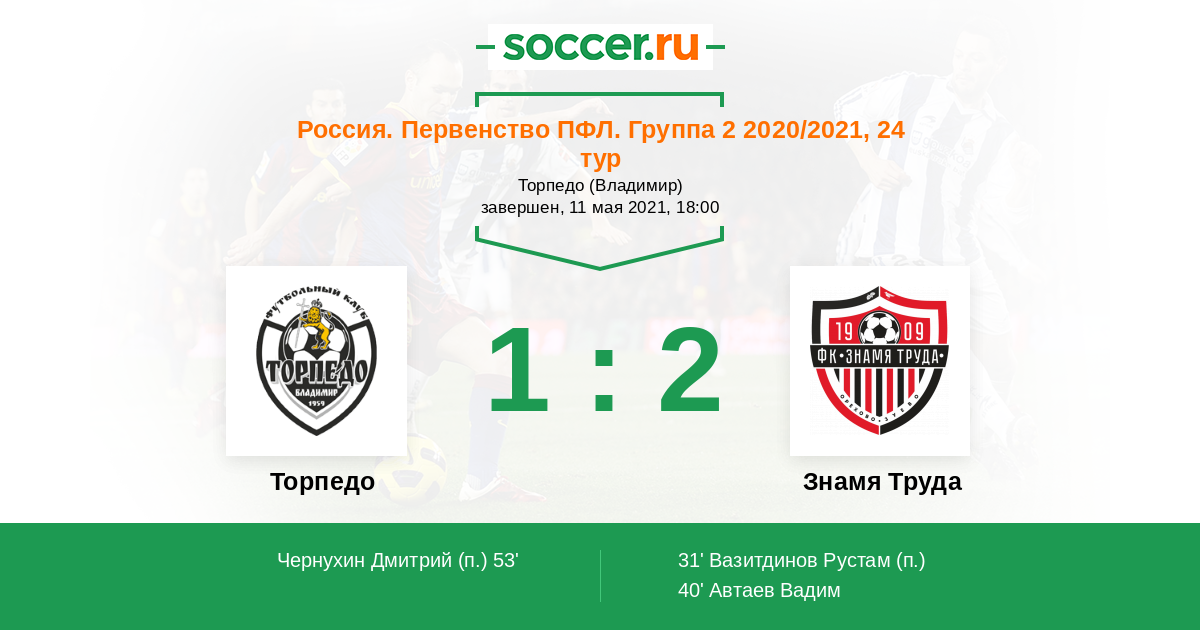 Россия. Вторая лига. Группа 2 21.05.2017 Торпедо Логотип футбольный клуб Торпедо (Владимир) 2:1 Логотип футбольный клуб Знамя Труда (Орехово-Зуево) Знамя Труда
