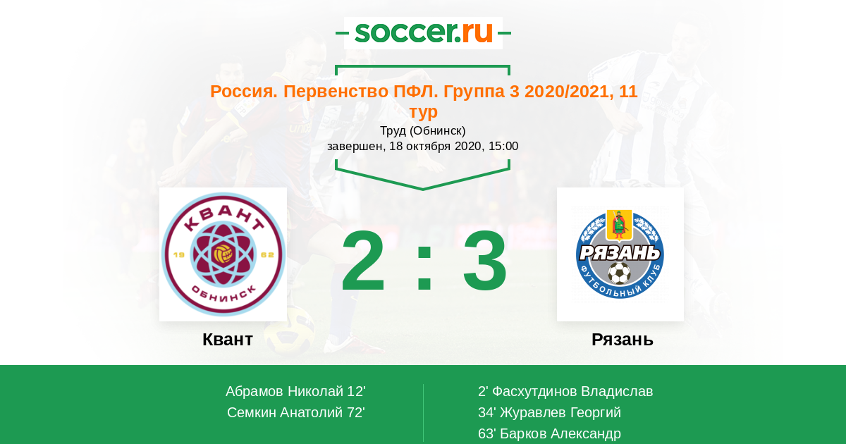 Россия. Вторая лига. Группа 3 06.04.2021 Рязань Логотип футбольный клуб Рязань 3:2 Логотип футбольный клуб Квант (Обнинск) Квант