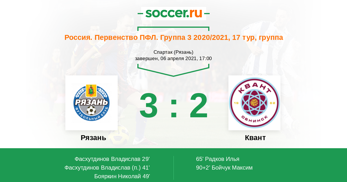 Россия. Вторая лига. Группа 3 27.04.2019 Рязань Логотип футбольный клуб Рязань 3:3 Логотип футбольный клуб Квант (Обнинск) Квант