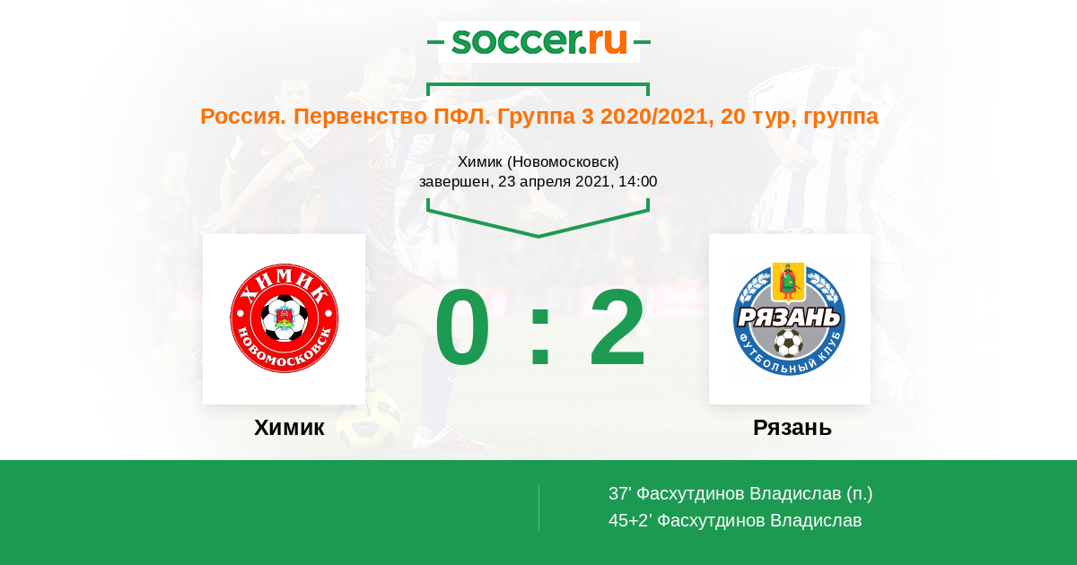 Россия. Вторая лига. Группа 3 23.04.2021 Химик Логотип футбольный клуб Химик (Новомосковск) 0:2 Логотип футбольный клуб Рязань Рязань