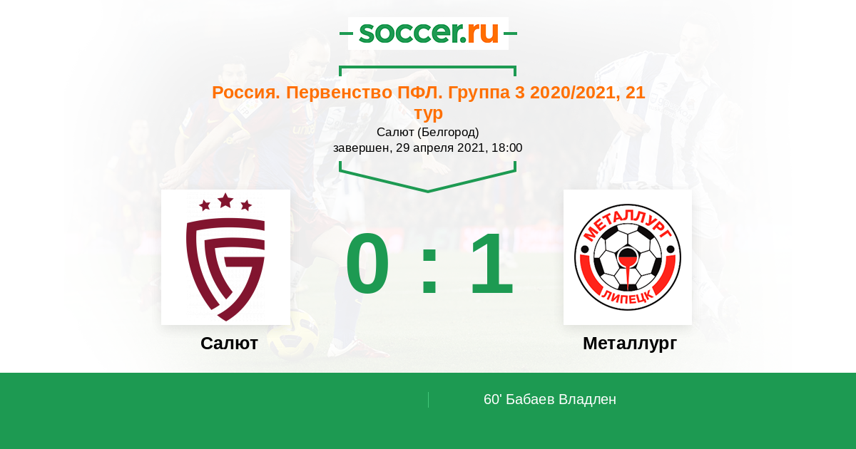 Россия. Вторая лига. Дивизион «Б». Группа 3 29.03.2025 Салют Логотип футбольный клуб Салют (Белгород) 1:0 Логотип футбольный клуб Металлург (Липецк) Металлург