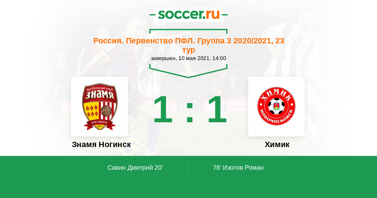 Россия. Вторая лига. Группа 3 10.05.2021 Знамя Ногинск Логотип футбольный клуб Знамя Ногинск 1:1 Логотип футбольный клуб Химик (Новомосковск) Химик