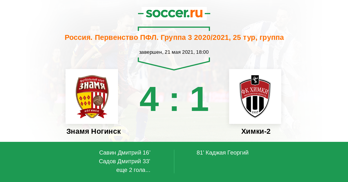 Россия. Вторая лига. Группа 3 21.09.2020 Химки-2 Логотип футбольный клуб Химки-2 1:3 Логотип футбольный клуб Знамя Ногинск Знамя Ногинск