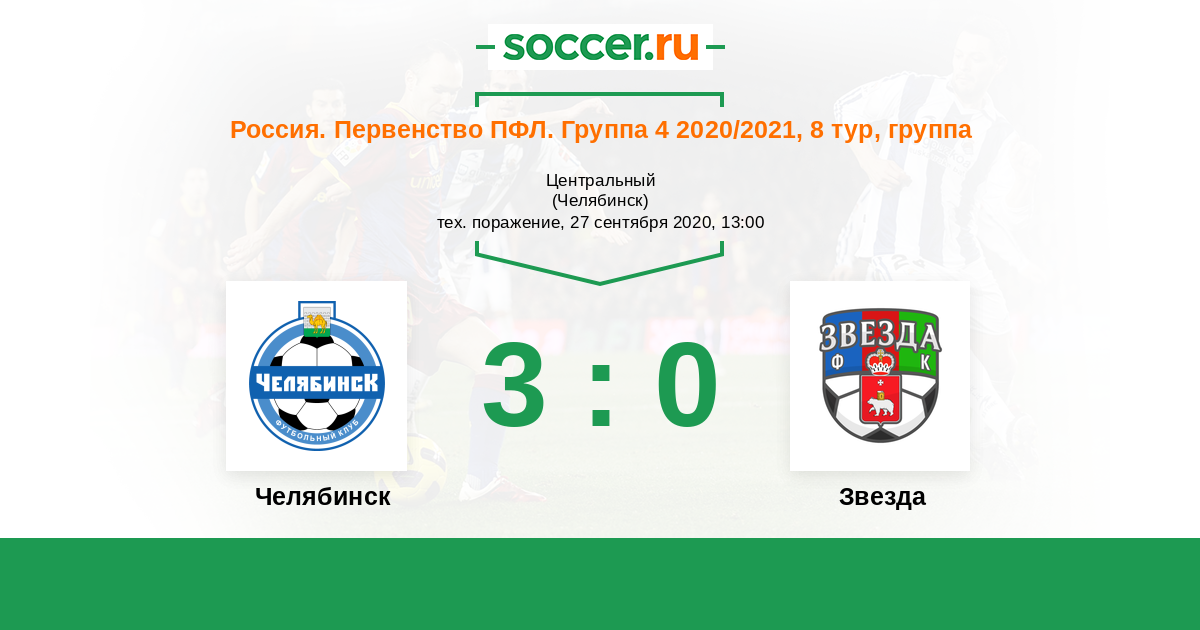 Россия. Вторая лига. Группа 4 26.04.2021 Звезда Логотип футбольный клуб Звезда (Пермь) 1:0 Логотип футбольный клуб Челябинск Челябинск
