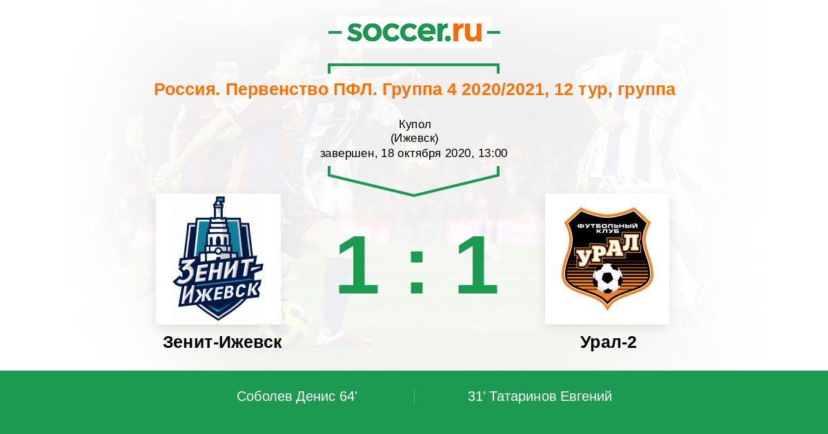 Россия. Вторая лига. Группа 4 02.09.2018 Зенит-Ижевск Логотип футбольный клуб Зенит-Ижевск 1:1 Логотип футбольный клуб Урал-2 (Екатеринбург) Урал-2