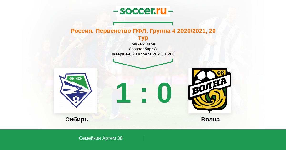 Россия. Вторая лига. Группа 4 04.10.2020 Волна Логотип футбольный клуб Волна (Ковернино) 0:1 Логотип футбольный клуб Сибирь (Новосибирск) Сибирь