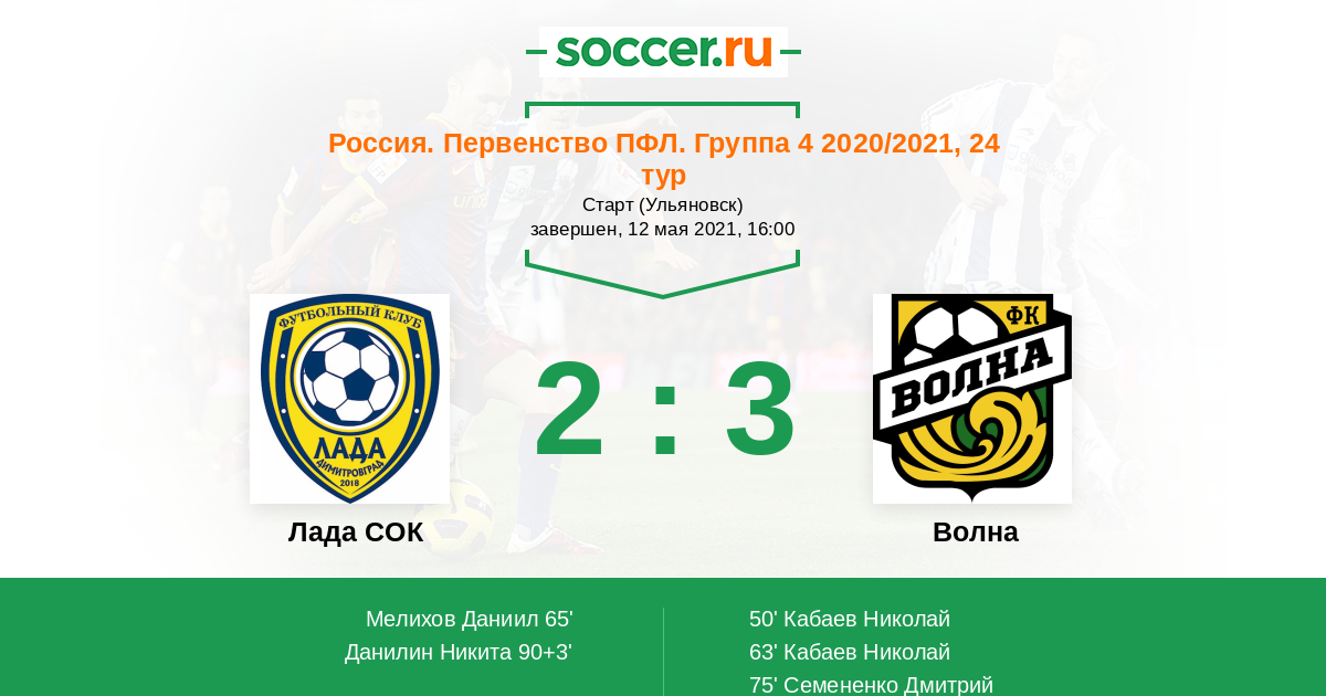 Россия. Вторая лига. Группа 4 12.05.2021 Лада СОК Логотип футбольный клуб Лада СОК (Димитровград) 2:3 Логотип футбольный клуб Волна (Ковернино) Волна