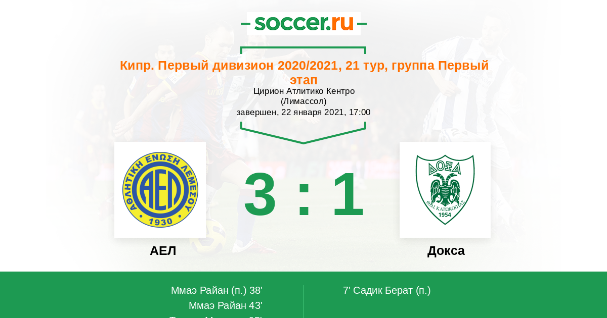 Кипр. Первый Дивизион 26.10.2020 Докса Логотип футбольный клуб Докса (Катокопиас) 1:2 Логотип футбольный клуб АЕЛ (Лимасcол) АЕЛ